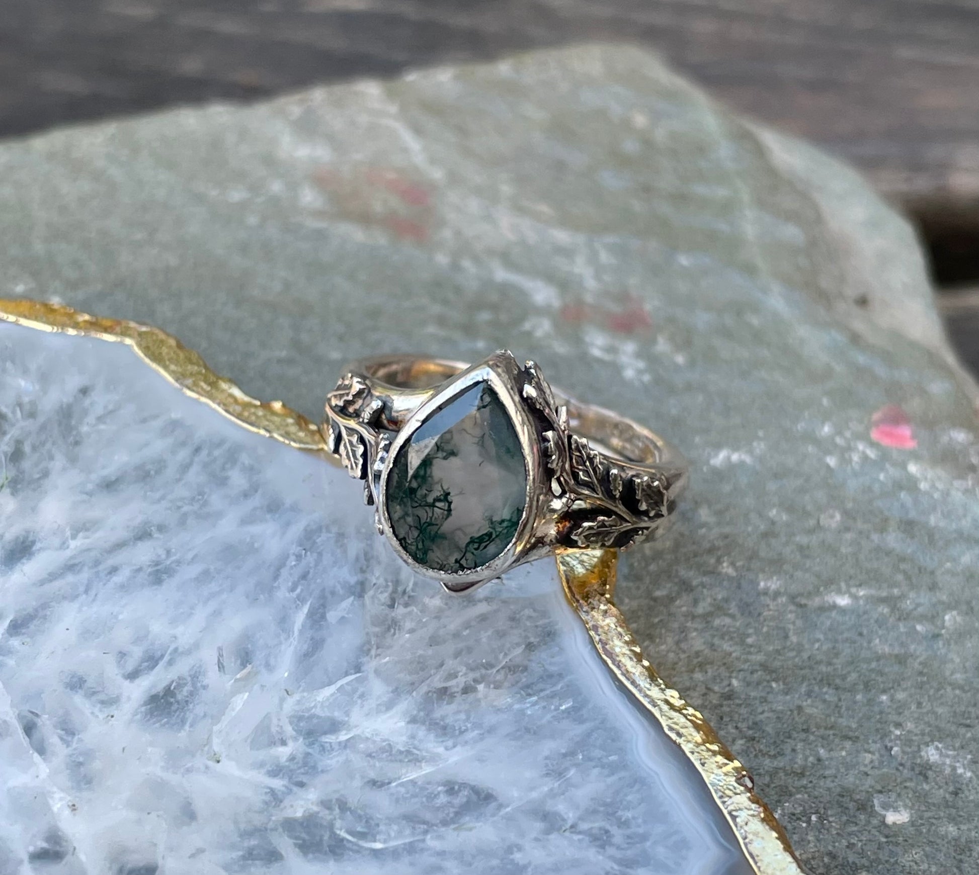 This ring is handcrafted in eco silver. The band has a branch like effect which is filed by hand, meaning each ring will be slightly different! Each feature leaf detail. the whole ring is oxidised and then polished