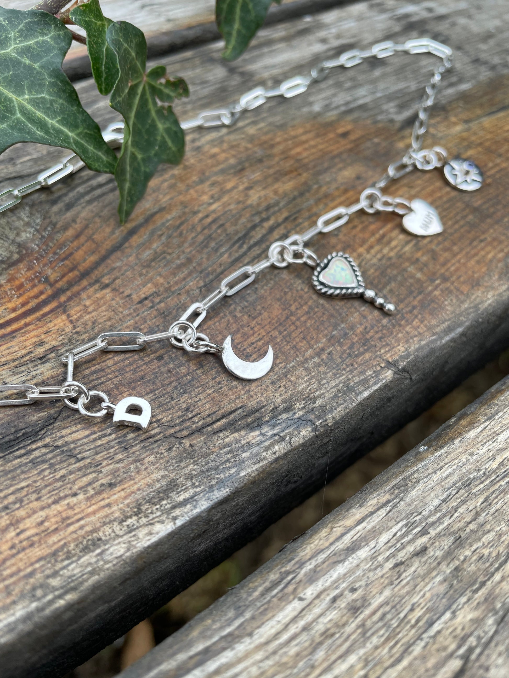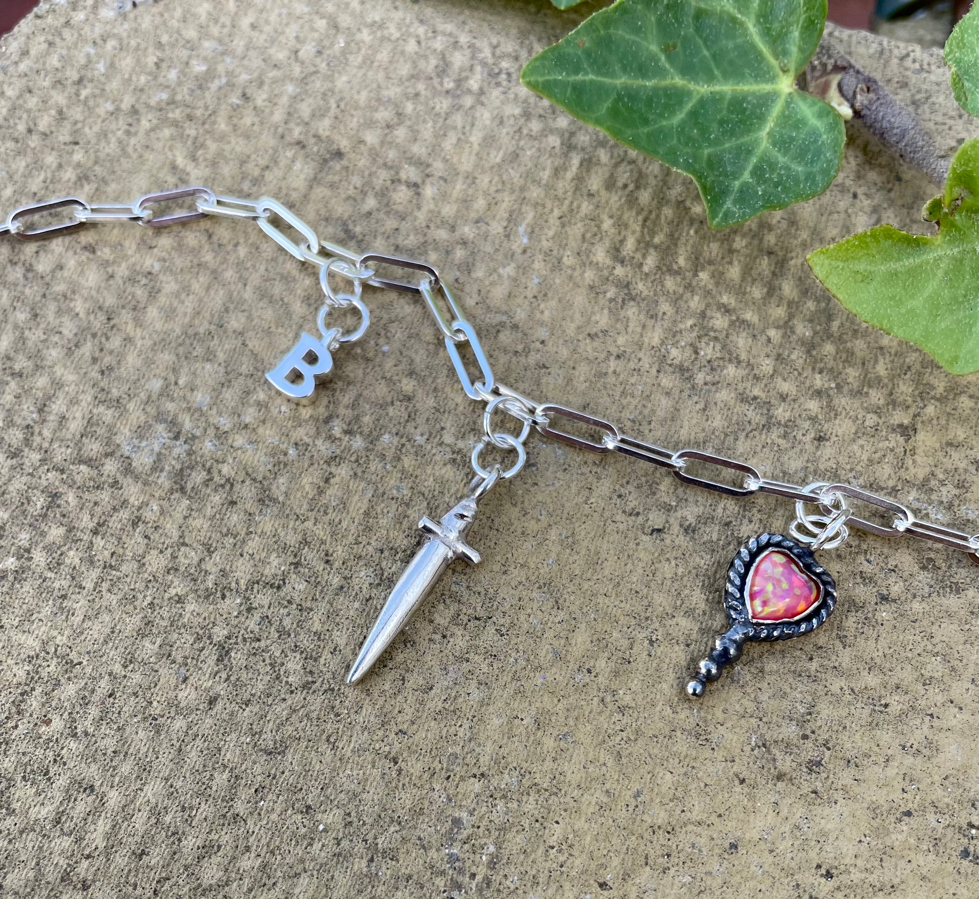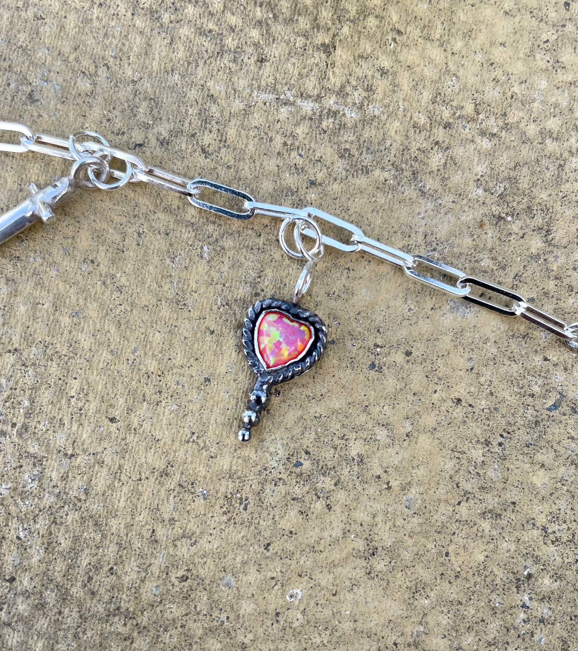 A beautiful coral coloured synthetic heart opal. Set in Sterling silver with an oxidised finish.
