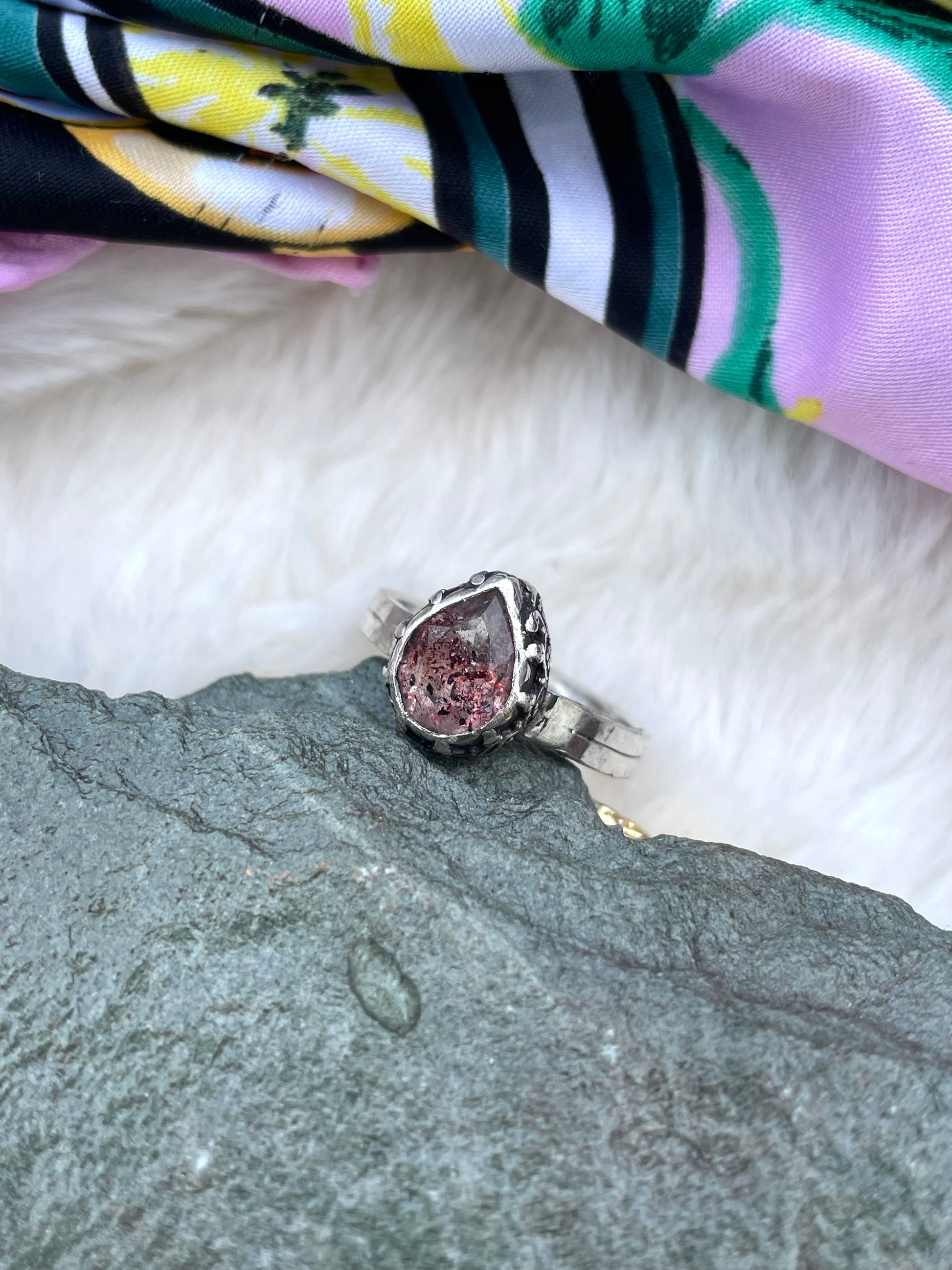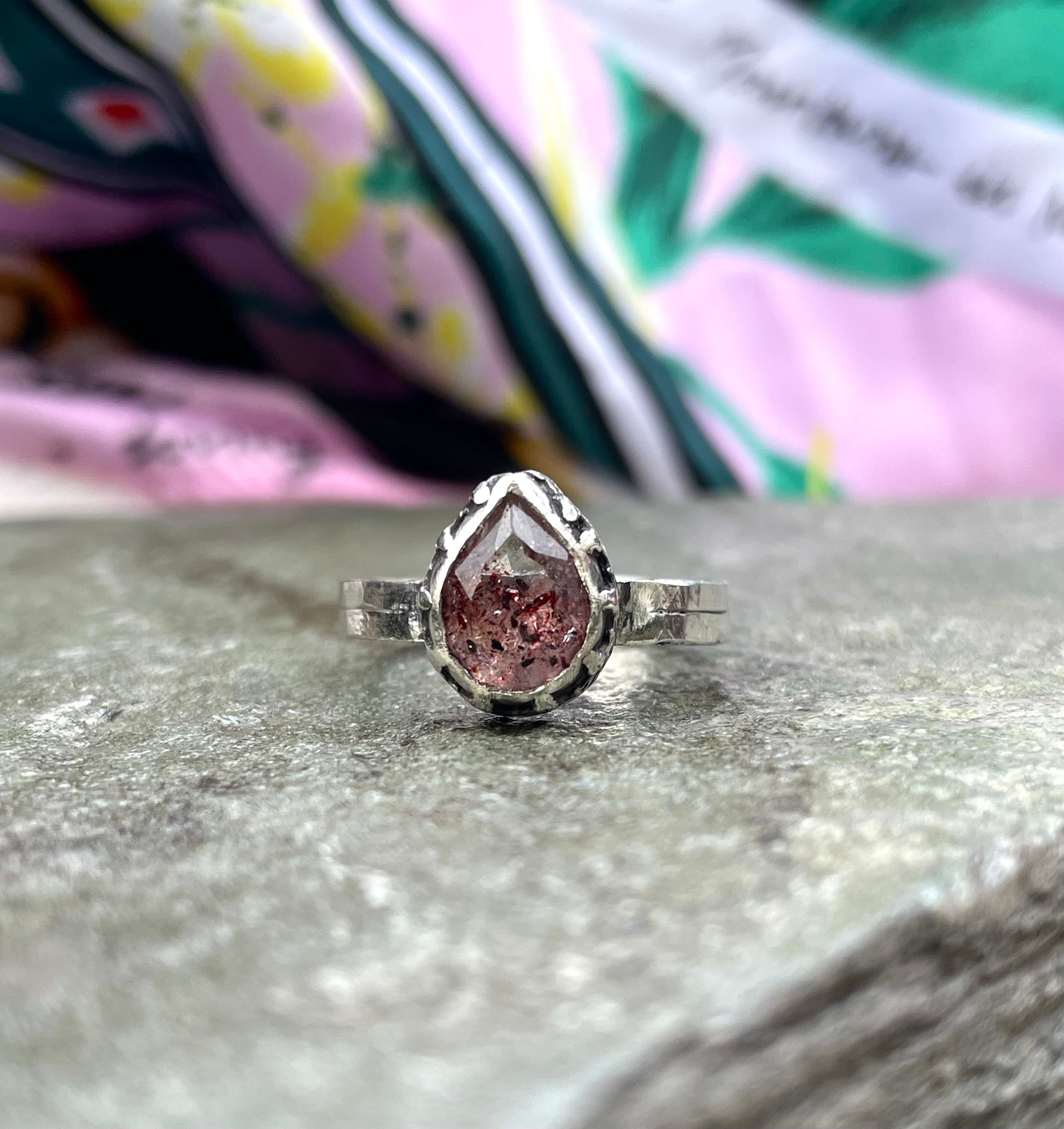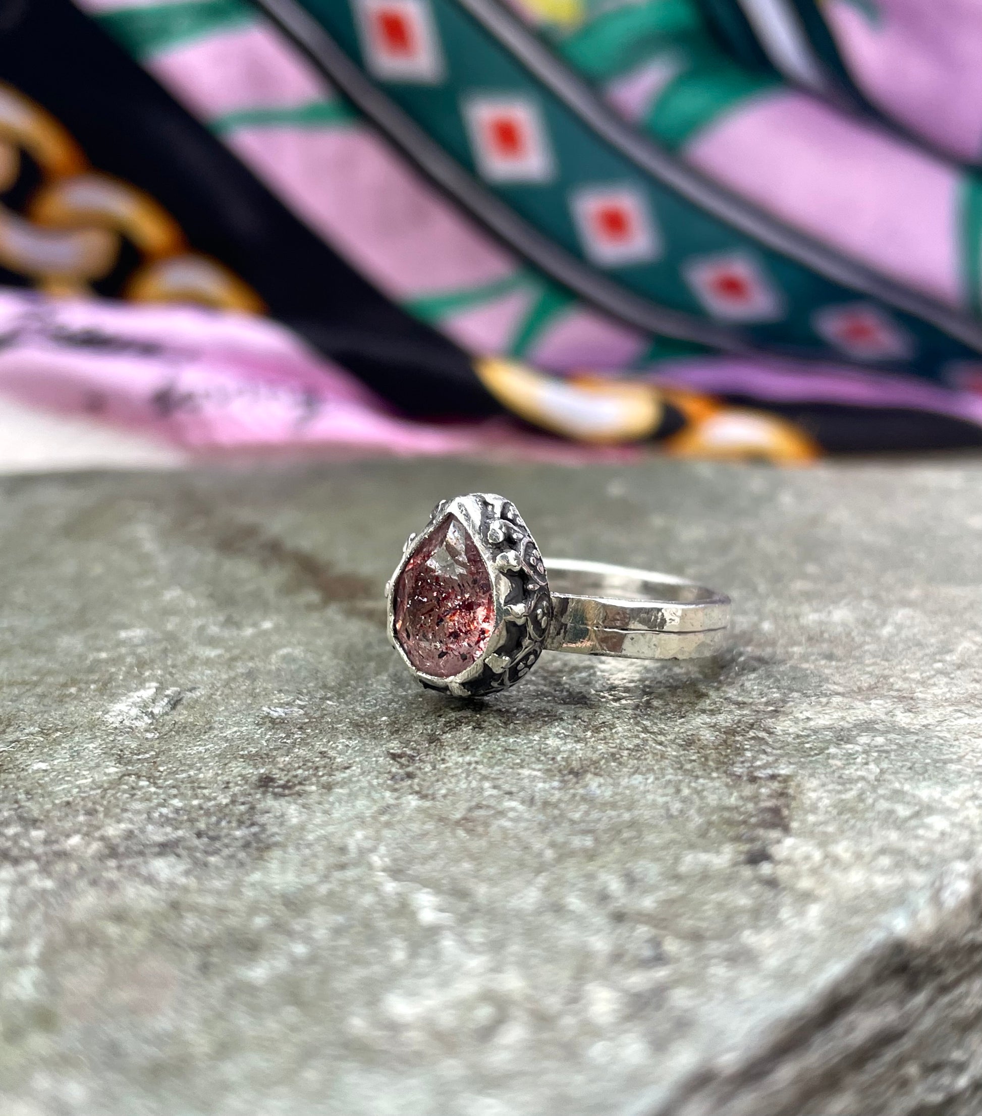 A beautiful pear shaped lepidocrocite (approx 10x7mm) set in Sterling silver. Featuring heart fleur bezel and oxidised to add depth