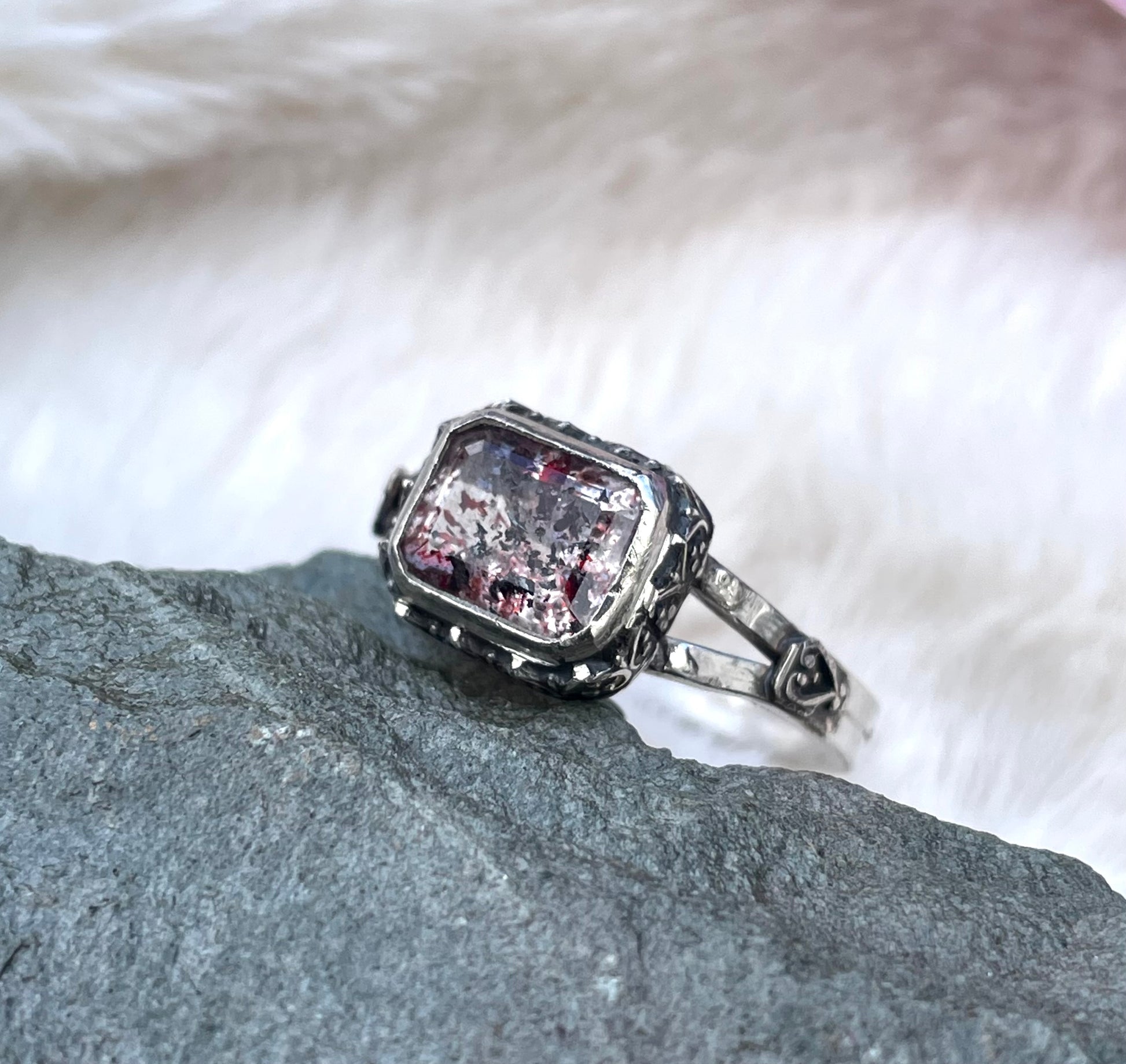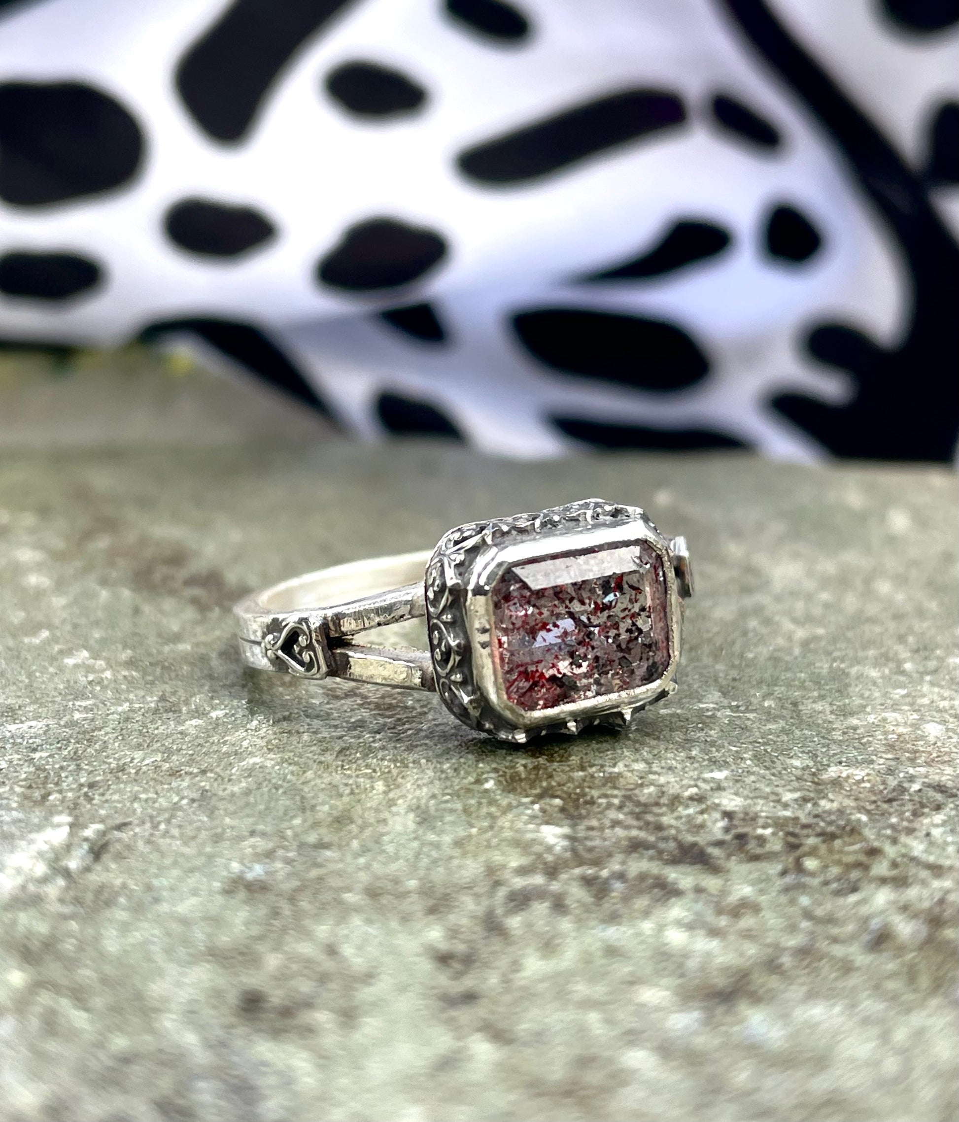 A beautiful octagonal shaped lepidocrocite (approx 9x7mm) set in Sterling silver. Featuring heart fleur bezel and oxidised to add depth