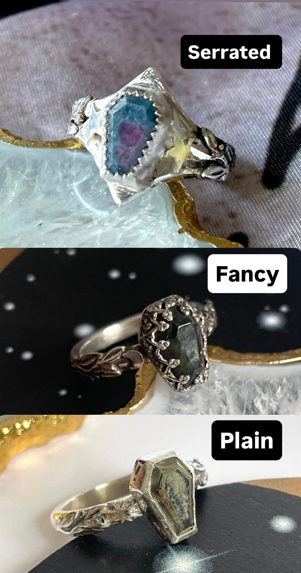 Your choice of coffin gemstone (approx 10x7mm) set in a beautiful filigree style setting. Double band with leaf detail and your choice of moon or star shoulders! Handcrafted in sterling silver
